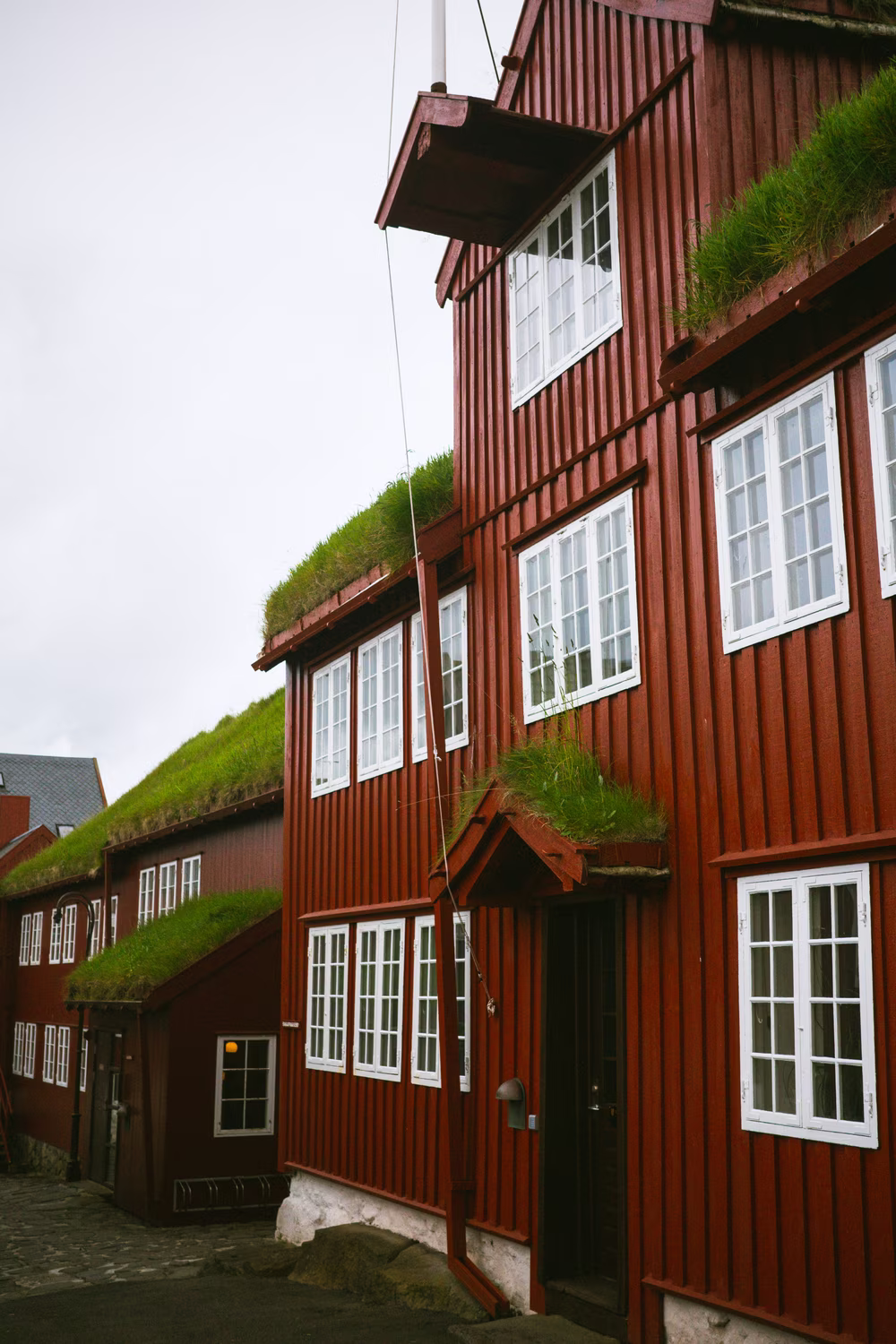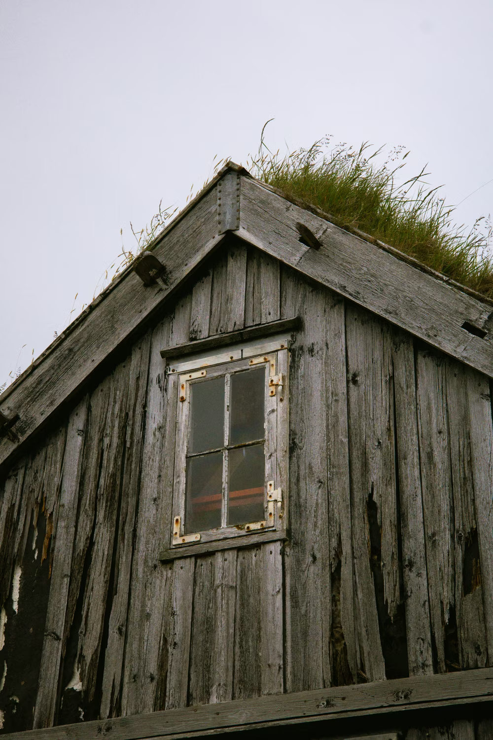 Why fight the landscape? For over a millennium, islanders have been topping their huts with birch bark and soil and let the grass grow wild. They act as insulation, and the thick roots are an excellent waterproof seal against the weather.